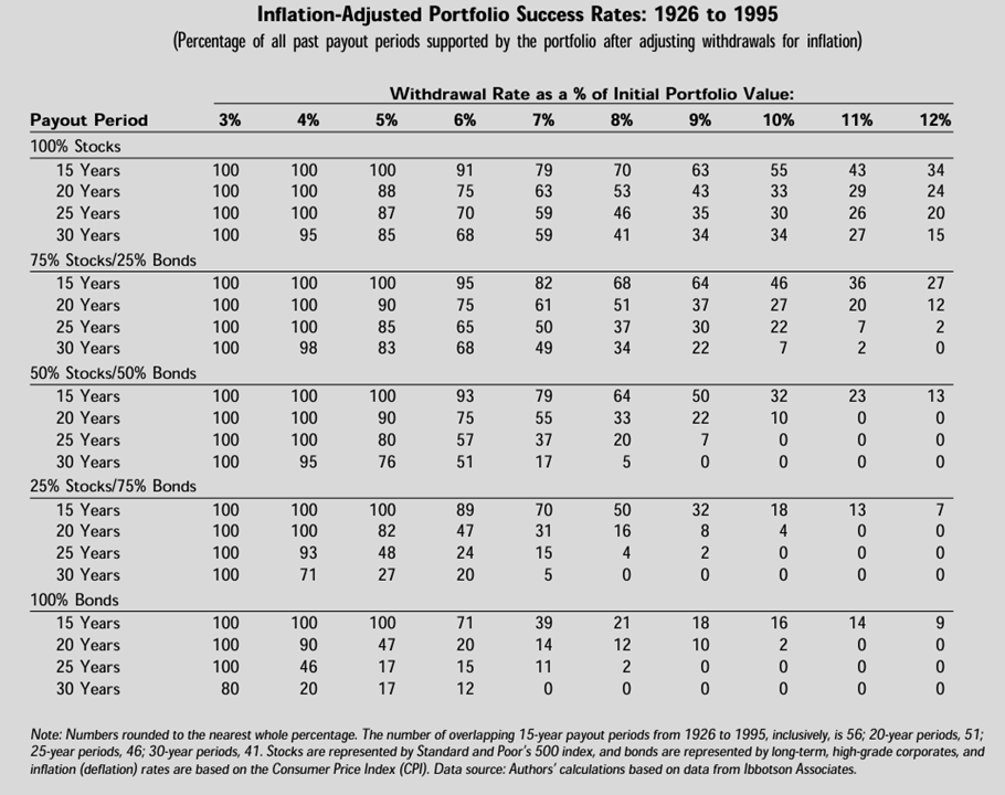 ※これらの成功率は、「30年間」「インフレ調整あり」「米国株(S&P500)と米国社債」「毎月リバランス」という前提条件で算出されたものです。他国の市場や別の資産クラスでは、同じ結果になるとは限りません。